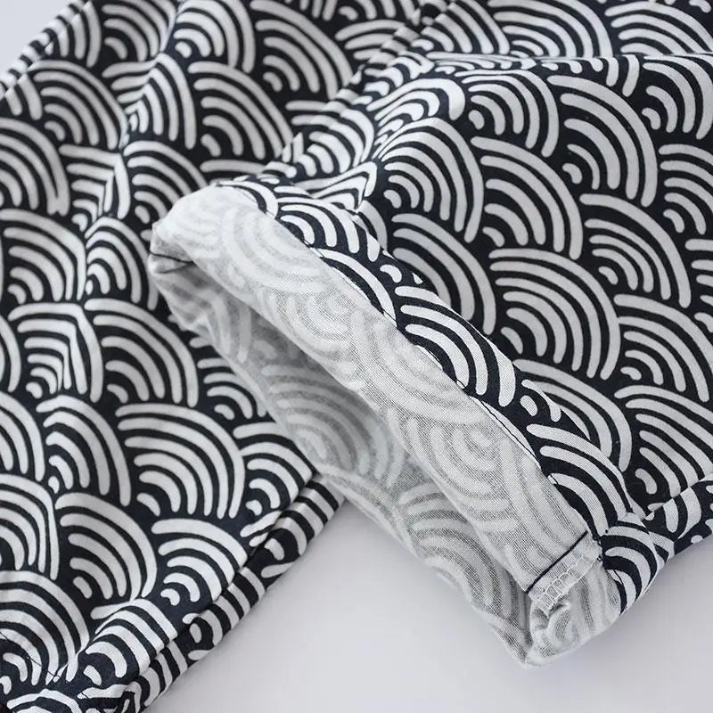 Décliné en Gris, Noir, ce jinbei se glisse dans le quotidien comme une habitude heureuse. Sa coupe ample offre une liberté de mouvement qui rappelle le confort du vestiaire japonais, tandis que sa taille élastique s'adapte à chaque morphologie avec discrétion.